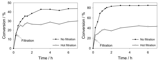 Application of the hot filtration test to Pd-SH-E-PMO (left) and Pd2+/Ph-PMO (right) catalyzed Suzuki cross-coupling reaction of bromobenzene and phenylboronic acid. Hot filtration was carried out at 15 min in the first case and at 5 min in the second case.