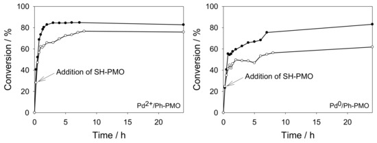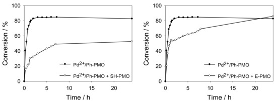 Catalyst poisoning tests using Pd2+/Ph-PMO as catalyst. SH-PMO (left) or E-PMO (right) materials were added at the beginning of the reaction.