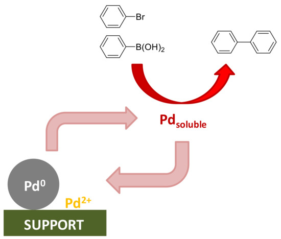 Typically, the Suzuki cross-coupling reaction is catalyzed by soluble palladium complexes, such as phosphorus or nitrogen-based complexes or “ligandless” palladium catalysts [23,24,25,26]. Although homogeneous catalysts frequently exhibit very high activity and selectivity, they usually have important drawbacks, as they normally are not reusable and also, the reaction products are frequently contaminated by palladium [27,28].