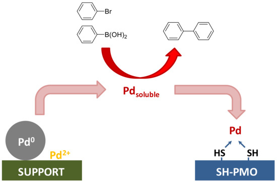 Schematic representation of the “release and catch” mechanism proposed for the palladium-catalyzed Suzuki cross-coupling reaction when SH-PMO is added to the reaction mixture, which acts as a palladium scavenger.