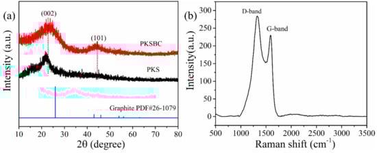 XRD patterns of PKS and PKSBC (a) and Raman spectra of PKSBC (b).