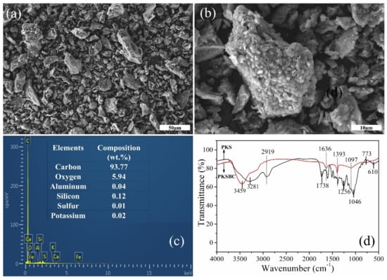 SEM images of PKSBC at different magnifications of 16k (a) and 60k (b), elemental composition of PKSBC (c), and FTIR spectrum of PKS and PKSBC (d).