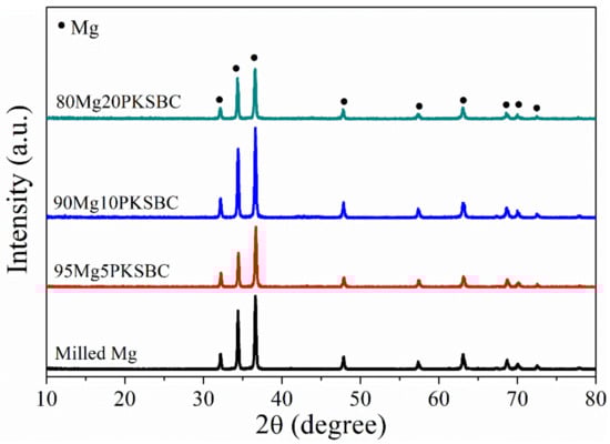 The XRD patterns of milled Mg and Mg-PKSBC composites, which predominantly consist of Mg phases, are presented in Figure 6. The diffraction peak of carbon is not apparent, which means the carbon from PKSBC is in order in a very short range, signifying it is amorphous. In the composites, the XRD diffraction of carbon is so weak as to be negligible, compared with that of β-MgH2 or Mg, whose crystal grains are much bigger. To evaluate the effect of ball milling pure Mg with PKSBC on the crystallite size of Mg, the Scherer equation [] was employed to calculate the changes in crystallite size as the PKSBC content was incorporated into the milling process. The calculated average crystallite sizes (calculated by considering the major diffraction peaks of Mg 100, 002, and 101) for milled Mg and 80Mg20PKSBC were 45 nm and 40 nm, respectively. From this, it is sound to propose that PKSBC acts as a milling aid to an extent. Additionally, there was a slight reduction in the intensity of the major peaks of Mg when the PKSBC content increased to 20 wt.%.
