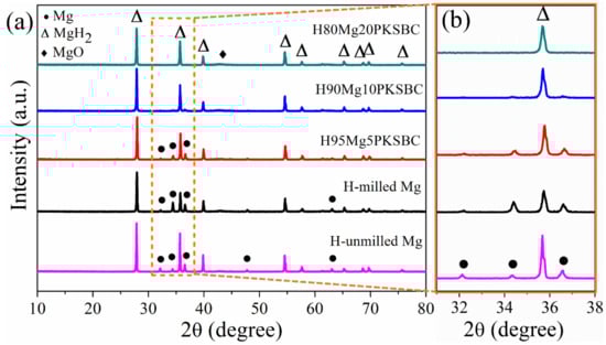 Figure 7a presents the XRD patterns of hydrided Mg/PKSBC at 360 °C. It shows that β-MgH2 is formed after high-pressure hydrogen absorption; from the XRD patterns of H95MgPKSBC and H90MgPKSBC it can be observed that Mg is present after the hydrogenation process. From these patterns it can clearly be seen that the amount of Mg phases reduces as the content of PKSBC increases from 5 wt.% to 20 wt.%. H80Mg20PKSBC patterns reveal the absence of Mg after hydrogenation, as shown in Figure 7b. However, MgO is detected when the PKSBC content is 20 wt.%, which can be attributed to the reaction between Mg and the oxygen-containing functional groups during the hydrogenation process at 360 °C.