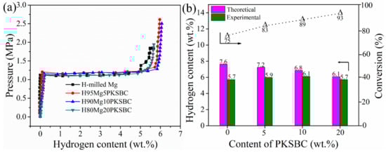 p-c-T curves of milled Mg and Mg-PKSBC composites (a) and bar chart comparison of theoretical, and experimental hydrogen capacity and conversion of Mg into MgH2 against PKSBC content (b).