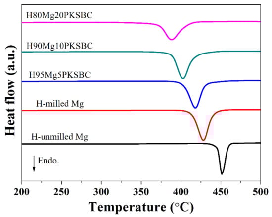 From Figure 9b it can be concluded that the complete conversion of Mg to MgH2 is feasible if the right size is achieved before hydrogenation. Additionally, the presence of PKSBC can help in the physical adsorption of hydrogen atoms, which can be further absorbed chemically by Mg. The physical adsorption of hydrogen onto carbon is able to be supported by the literature [], together with our previous report [] in which the formation of C-H dangling bonds during the hydrogenation process occurred. Another way in which PKSBC is beneficial to hydrogen sorption is via its surface chemical character; the presence of oxygen-containing functional groups can positively influence the hydrogen sorption process []. In Figure 10, the effect of increasing the contents of PKSBC on the decomposition temperatures of prepared hydrogen storage materials is presented.