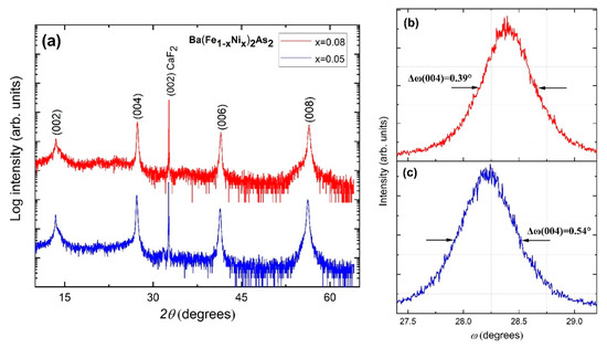 XRD patterns for Ba(Fe1−xNix)2As2 thin films grown on CaF2. (a) Standard θ–2θ XRD scans; rocking curves with determined full width at half maximum (FWHM) values of the (004) reflection for films with a nominal Ni content of: (b) x = 0.05 and (c) x = 0.08.