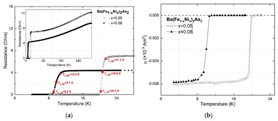 Temperature dependence of the resistance without a magnetic field (a) as well as susceptibility (b) for Ba(Fe1−xNix)2As2 films with x = 0.05 and 0.08.