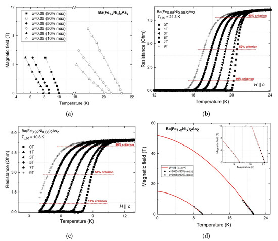 Temperature dependence of the magnetic field (a) and resistance in the applied magnetic field (b,c), as well as Werthamer–Helfand–Hohenberg (WHH) fitting with paramagnetic effect (d) for Ba(Fe1−xNix)2As2 films with x = 0.05 and 0.08. The complete dataset of the R(T,B) measurements is shown in a previous paper [16].