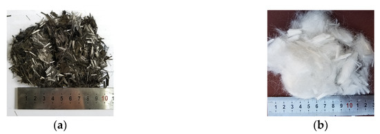 In this study, for fabricating the fiber-reinforced LWAC specimens, an angular expanded shale ceramist (Figure 1) from Hubei, China was used as the coarse aggregate in all mixtures. Table 3 lists the physical properties and size distribution of the LWA. This LWA was characterized by a vitreous shell outside and a porous structure inside. Pores inside the aggregate were generally independent of each other, which suggests a significant reduction in water absorption (24 h water absorption of 2.6%) as well as a high crushing strength of the aggregate [23]. Two types of fiber (carbon and polypropylene) were selected, as shown in Figure 2. The diameters of the carbon and polypropylene fibers were approximately 7 and 80 μm, respectively. The mechanical properties and geometric information of these two fibers, as provided by the manufacturers, are listed in Table 4.