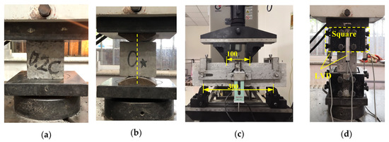 Mechanical property test setup for: (a) cube compressive strength, (b) splitting tensile strength, (c) flexural strength, (d) stress–strain curve.