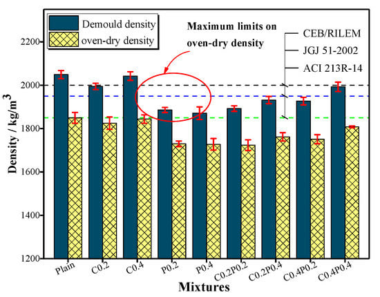 In some cases, the density of the concrete is more important than the strength, particularly for the lightweight concrete. A decreased density for a comparable level of strength enables a decreased dead load for the structural design. Two types of density, namely demolded density and 28-day oven-dry density, were measured and are presented in Table 7 and Figure 5. As can be observed, the demolded density and oven-dry density are within the range of 2049–1871 kg/m3 and 1849–1724 kg/m3, respectively. The demolded density of the concrete was approximately 150 to 200 kg/m3 higher than its oven-dry density. The demolded density varied with the absorbed moisture content as well as the degree of hydration, and thus, it is suggested that the oven-dry density was more representative than the demolded density. Figure 5 shows the upper limitation of the oven-dry density of LWAC based on several standards. The 28-day compressive strength of the concrete varies between 41 and 67 MPa for an oven-dry density of 1724–1849 kg/m3, which fulfills the requirements for structural LWAC with respect to the density and strength [37,38].