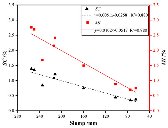 Comparing the results of the slump test with the segregation test, the segregation parameters almost keep in line with the changing trend of the slump values. The relationship between slump value and segregation parameters are graphically represented in Figure 6, which can be described by the first-order polynomials. Both SC and MI tend to decrease with the decrease of the slump value. The correlation coefficients of the fitting line are small enough to indicate a reasonable correlation between the slump and segregation parameters. This conclusion is consistent with the observation from Daneti and Wee [28], who reported the presence of a reasonable relationship between segregation resistance and workability.