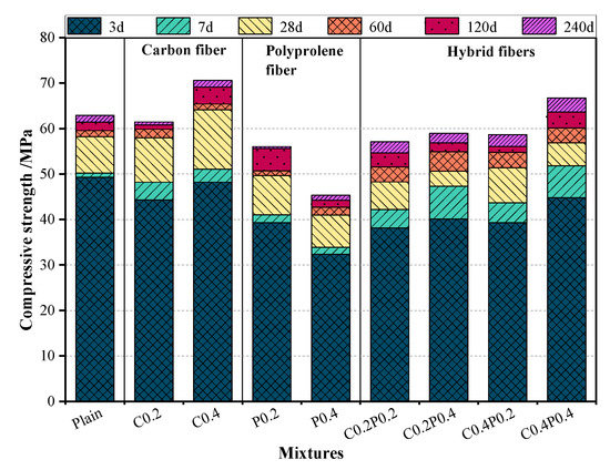 As can be observed, the incorporation of single carbon fibers, polypropylene fibers, and a hybrid of both reduced the slump by approximately 16%–60%, 2%–9%, and 16%–74%, respectively, compared with that of the plain mixture. As expected, the addition of fiber resulted in a negative effect on the workability of the fresh concrete, which might be associated with the confinement and obstructive effect of the fiber [35]. The highly specific surface area of carbon fiber and its hydrophilic surface may be another important reason. However, an exception to this occurred, in which the addition of polypropylene fiber did not significantly alter the slump value of fresh concrete, which can be observed in the results of the comparison between both PP0.2 and PP0.4 as well as C0.4PP0.2 and C0.4PP0.4. Similar results can be gained from the test results of Libre et al. [36]. The reason for this is attributed to the hydrophobic surface of the polypropylene fiber, which helps prevent a balling effect by the fiber. The water demand of polypropylene fiber in the mixed concrete is zero; moreover, with the addition of a superplasticizer, an adverse effect of polypropylene fiber on the workability can be overcome.