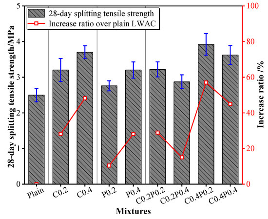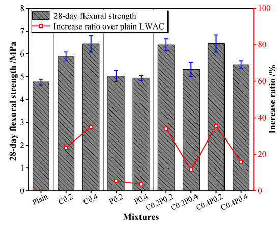 In this study, splitting tensile and flexural tests were conducted to investigate the tensile behavior of LWAC. The variations in splitting tensile and flexural strengths in response to carbon and/or polypropylene fiber content are shown in Figure 9 and Figure 10. As expected, both the splitting tensile and flexural strengths of the LWAC were continuously improved under any combination of incorporated fibers. The splitting tensile strength increments of single carbon fiber and polypropylene fiber reinforced LWAC ranged from 28.2% to 48.2% and 10.4% to 28.1%. Instead, the enhancement was 15% to 57% for hybrid fiber-reinforced LWAC. As referred to the flexural strength, the improvements of LWAC containing carbon and polypropylene fiber were within the range of 23.6%–35.1% and 3.6%–5.6%, respectively, and the increased percentage of hybrid fiber-reinforced LWAC ranged from 11.6% to 35.5%. Among the hybrid fiber-reinforced concrete, when the carbon fiber content was fixed, both the splitting tensile and flexural strengths decreased with an increase in the amount of polypropylene fiber. It can be concluded that the addition of carbon fiber in the LWAC is more effective compared with that of polypropylene fiber in improving the tensile strength, particularly the flexural strength, owing to the higher elastic modulus of the carbon fiber and better adhesion with the cement paste. Destruction of the carbon fiber can be observed on the fractured surface of the specimens, depicting significant bonding properties of the carbon fiber with cement paste [49]. Furthermore, the highest increment in the splitting tensile and flexural strength was obtained for the C0.4PP0.2 mixture. In this mixture, the fiber hybridization increases the tensile strength of LWAC more than that of the single fiber, showing a positive synergy effect between the carbon and polypropylene fiber. In addition, adding fiber to the concrete results in higher efficiency in improving the flexural strength than the splitting tensile strength. More recently, as Yew et al. [39] stated, a low fiber dosage up to 0.375% was more effective in improving the flexural strength.