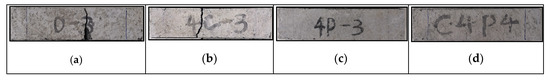 Figure 11 shows the typical failure mechanism of LWAC specimens, which can directly reflect the fiber reinforcement. For plain and carbon fiber-reinforced LWAC, the fracture surface propagated throughout the entire cross-section accompanied by the breaking of the carbon fiber and a fractured specimen. By contrast, when referring to the polypropylene and hybrid fiber-reinforced LWAC, the fracture surface simply propagated through a portion of the cross-section, which suggests an effective interfacial adhesion between the fibers and cement paste.