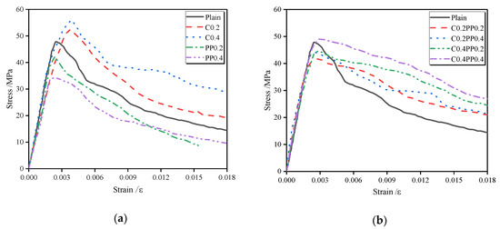 The effect of carbon and/or polypropylene fiber on the compressive stress–strain curves: (a) fiber in single form; (b) fiber in hybrid form.