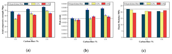 Stress–strain characteristic values for LWAC reinforced with carbon and/or polypropylene fiber: (a) axial compressive strength; (b) peak strain; (c) elastic modulus.