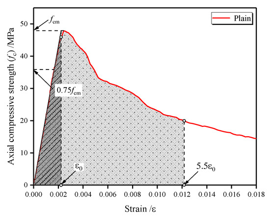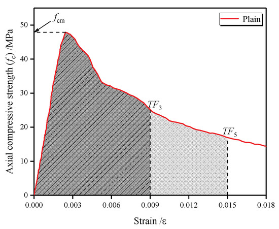 Herein, TR3 and TR5 are the compressive toughness ratios up to a strain of ε3 and ε5, respectively; ε3 and ε5 are the strain corresponding to specified strain of 0.009 and 0.015, respectively; and fcm is the axial compressive strength. As illustrated in Figure 16, TR3 and TR5 are the integral of stress–strain curve before the specified strain of 0.009 and 0.015, respectively.