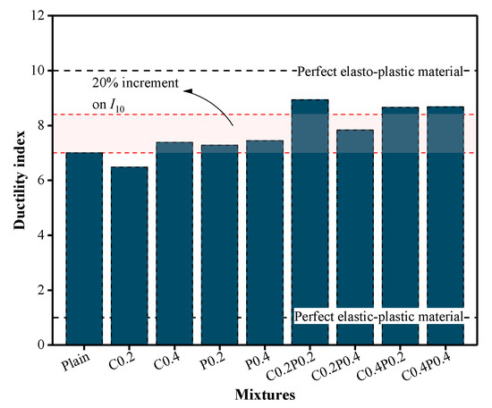 The post-peak ductility of concrete, related to the deformability, can be quantitatively evaluated based on the ductility index. In accordance with ASTM C1018-92 [58], the ductility index (I10) can be defined as the ratio of the integral of the stress–strain curve at up to 5.5-times the specified strain of the mixture to the integral of the curve up to the specified strain of the mixture (Equation (3)). The specified strain, ε0, is the strain corresponding to the elastic behavior limit, which can be determined based on the 3/4 rule. In the stress–strain curve, the ascending branch is secant at 75% of the peak stress and extrapolated until reaching the peak stress to determine the specified strain, as plotted in Figure 14 [59]. This definition provides a value of 10 for I10 corresponding to a perfect elasto-plastic material and a value of 1 corresponding to a perfect elastic-brittle material [60].