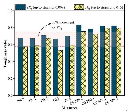 The influence of fibers on the energy-absorbing capacity can be determined by the toughness, which is calculated based on the integral of the stress–strain curve up to the specified strain. However, because the toughness is affected by the incorporation of fiber as well as the compressive strength, the toughness ratio (ratio of toughness-to-specified strain and compressive strength fcm) may be considered a more efficient way to evaluate the energy-absorbing capacity, as proposed by Nataraja et al. [61] and Jang and Yun [62]. Meanwhile, the toughness ratio is recognized as a good measure for the relative absorbed energy. The specified strain values were three- and five-times the ultimate strain of 0.003 recommended by the ACI standard [63]. It was reported by Fenella and Naaman [64] that the specified strain of 0.015 is sufficient to reflect the characteristic of the post-peak stress–strain behavior.