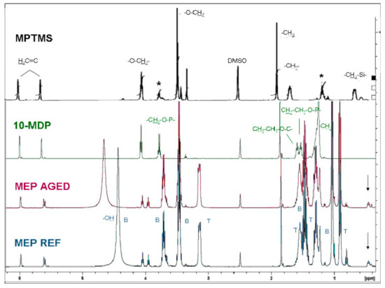 1H-NMR spectra of MEP, before and after aging, and of the controls (prehydrolysed MPTMS, 10-MDP). T and B peaks are assigned to TADF and butanediol, respectively. Arrows show the SiCH2CH2Si peaks of MEP and asterisks the ethoxylated derivatives in hydrolysed MPTMS.