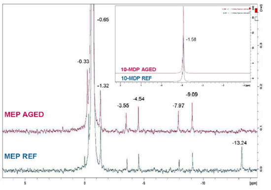 31P-NMR spectra of MEP and 10-MDP control (insert) before and after aging.