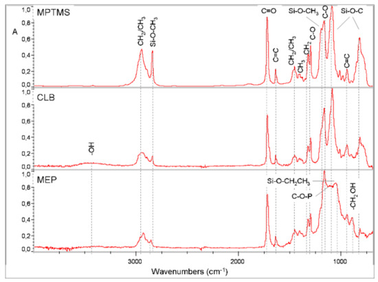 Representative micro MIR-FTIR spectra of MEP, CLB and of reference non-hydrolyzed MPTMS (Evonik Industries, Darmstadt, Germany), recorded immediately after application on the Ge crystals (T0) are illustrated in Figure 4. The peaks identified were (in cm−1): –OH (3460 in MEP, CLB), CH2/CH3 (2900–2800, 1450, 1400, in all), Si–OCH3 (2840, 1185, 1088, in all; the first shifted +10 cm−1 in MEP), C=O (1720, 1320, 1164, in all), C=C (1635, 940, 810, in all), Si–O– CH2CH3 (1049 cm−1, in MEP), CH2–O–P (1035, in MEP), CH2–OH (880, in MEP), and Si–OH (904, in MEP, CLB).
