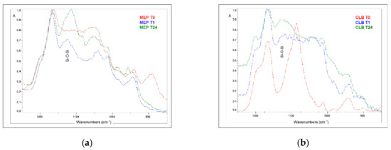 Expanded spectra of MEP and CLB at the 1250–850 cm−1 band range recorded at T0, T1, and T24 are illustrated in Figure 5. This range includes the silane absorption bands of methoxy (Si–OCH3; 1850, 1088 cm−1), ethoxy (Si–OCH2CH3; 1049 cm−1), siloxane (Si–O–Si; 1130–1000 cm−1), CH2=C– (940 cm−1), silanol (Si–OH; 904 cm−1) and ethanol related (–CH2–OH; 881 cm−1) groups [23]. At T1, new peaks of Si–O–Si antisymetric and symmetric vibrations appeared at 1130–1100 and 1050–1000 cm−1 respectively, which further increased in intensity at T24 implying the formation of condensates.