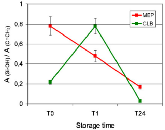 The silanol consumption rate during the 24 h testing period was monitored by plotting the silanol (Si–OH, 904 cm−1) to the C=C (CH2=C–, 940 cm−1) peak area ratios obtained from the curve-fitted spectra of MEP and CLB (Figure 6). The results are presented in Figure 7. MEP demonstrated a reduction of the ratio as a function of time. However, CLB at 1 h (T1) demonstrated significantly higher ratio than the initial values (T0), which were then strongly reduced at 24 h (T24).