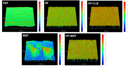 3D-profilometric images (40× magnification) of the polished lithium disilicate ceramic before (REF, 1.14 μm amplitude range) and after treatments with HF (8 μm amplitude range), HF+CLB (7.01 μm amplitude range), MEP (4.18 μm amplitude range), and HF+MEP (5.5 μm amplitude range).
