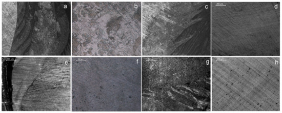 Representative reflected-light microscopic images of debonded ceramic surfaces (50×, bar = 200 μm) demonstrating Type III (mixed) failures with a great part of ceramic surface coverage by resin (a, c, g), Type III failures with minimal resin coverage (b, e) and Type I (adhesive) failures (d, f, h).