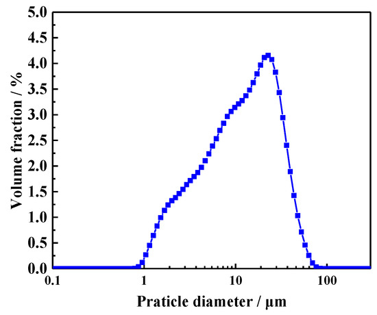 The cement used for the preparation of CHPs and mortar mixtures was Ordinary Portland Cement (CEM, I 52.5N, which was supplied by Jiangnan-xiaoyetian Cement Co., Ltd. and produced in Nanjing, Jiangsu, China.) with a particle density of 2.7–3.2 g/cm3. Its specific surface area range was 0.30–0.40 m2/g. The particle size distribution of the cement was measured by laser particle size analysis (LS320) (Beckman Coulter, Brea, CA, USA), as shown in Figure 1. Its average particle size was 16.1458 μm. The grain size of quartz sand ranged from 0.425 to 0.212 mm. Its specific gravity was 2.65 g/cm3. The chemical compositions are presented in Table 1. River sand was provided by a local supplier of building materials, with a maximum grain size of 3 mm and bulk density of 1.577 g/cm3.