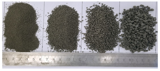 The CHPs prepared with different dosages of Na2CO3 (See Figure 3) exhibited diverse grain size distributions. The pellets were sieved after 15 days of curing and divided into five size ranges, namely 0.16–0.315 mm, 0.315–0.63 mm, 0.63–1.25 mm, 1.25–2.5 mm and 2.5–5 mm. After baking for 48 h in an oven at 50 °C, the size grading and bulk density of the sieved pellets were tested according to JGJ-52-2006 [32].