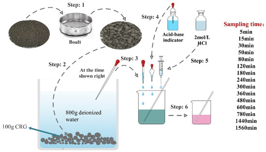 Due to the hydrophilicity of cement-based materials, Na2CO3 in the outer shell of CHPs is easy to dissolve in aqueous solution. In this study, the dissolving rate was measured by a titration experiment. The indicator was a mixture of bromocresol green and methyl red, and the standard titration solution was 1.5 mol/L hydrochloric acid. The experiment was carried out with 100 g dried CHPs and 800 g deionized water as shown in Figure 4. This timer was started when the pellets were put into the deionized water. Later, 10 g solution was taken out from the container by dropper at the sampling time and two drops of acid-base indicator was added into it. Then, hydrochloric acid was added into the solution drop by drop to observe the color change of the solution. The experiment was terminated when the color changed from green to pink. The dosage of hydrochloric acid and the concentration of alkali ions in the solution were collected.