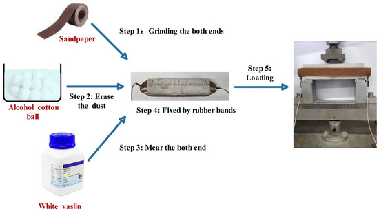 Caused by the degree of damage, the acoustic emission signal exhibits different energy, amplitude, etc. Real-time dynamic monitoring detects the internal damage of the mortar under stress, and receives these signals by broadband transducers installed at either end of specimens as shown in Figure 5 [41,42]. The transducers (R15) with a broadband response ranging from 60 to 400 kHz and a maximum sensitivity at 150 kHz were used. The cumulative energy of signals was calculated when the load of the four-point bending test reached 60% Fmax during the preloading and breaking process. The cumulative energy ratio was recorded as the cumulative energy of the secondary load divided by that of the first load.