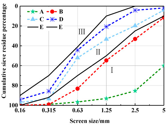 Gradation zone curve of CHPs. (E) Boundary line of the sand in Zone II.