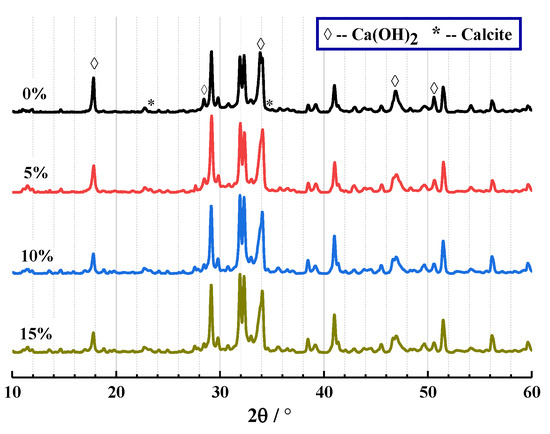 The results of XRD and TG are shown in Figure 7 and Figure 8 below. From Figure 7, the crystal components of CHPs include calcite and Ca(OH)2. This proves that Na2CO3 promoted the production of calcite, which was similar to how the process of carbon dioxide acted. It confirms that the “build-in” carbonation of concrete could be realized by introducing Na2CO3 internally.