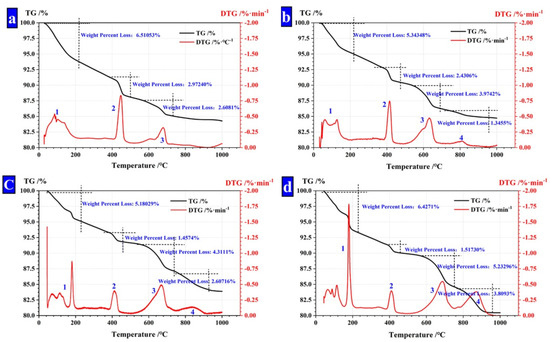 TG analysis of CHPs. (a) CHPs with 0% NaCO3; (b) CHPs with 5% NaCO3; (c) CHPs with 10% NaCO3; (d) CHPs with 15% NaCO3.