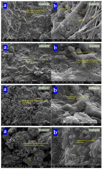 The morphology of pellets is shown in Figure 9. It shows that with the dosages of Na2CO3 increasing, pellets become loose gradually. It affirmed that the addition of Na2CO3 decreased the mechanical property of cement specimens [43]. While the surface of Pellets A was composed of C-S-H gel and ettringite, with the dosages of Na2CO3 in pellets increasing, the content of ettringite decreased obviously. Then, the content of gel was also replaced by crystal until the surface of CHPs was gradually covered by crystals. Especially Pellets D, the surface was filled with crystals without gel and ettringite, which means Na2CO3 promoted the formation of calcite to cross-linking in the cement mortar. The introduction of Na2CO3 inhibited or consumed the production of ettringite, and promoted the formation of calcite.