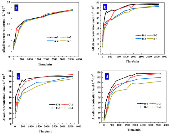 The concentration changes of alkaline ions that CHPs dissolved in deionized water are shown in Figure 10. It shows that when soaked for 10 hours, the alkaline concentrations of the leaching solutions of pellets A, B, C and D were, respectively, 77.16%, 74.4%, 70.68% and 68.23% of the final concentration (after soaking for 60 h). When the alkali concentration was 80% of the final concentration, the soaking time of pellets A, B, C and D was 10 h, 12 h, 13 h and 16 h, respectively. It means that with the dosages of Na2CO3 increasing, the ion release speed was increased while the ion release ratio (ratio of current alkali concentration to final alkali concentration) was decreased. The ion release ratio showed an obvious differentiation for pellets with different size ranges as shown in Figure 11a–d, which illustrates the release rates of CHPs with 0%, 5%, 10% and 15% dosages of Na2CO3, respectively. Larger pellets put up a lower ion release ratio in deionized water, and this effect was more obvious with the dosages of Na2CO3 in the pellets increasing. It illustrates that large pellets have a better effect on the storage of CO32− than small pellets, especially in pellets with higher dosages of Na2CO3. Their denser surface reduced the ion release of CHPs.