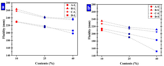 The fluidity of mortar that have been compound allocation. (a) Large-sized pellets; (b) small-sized pellets.
