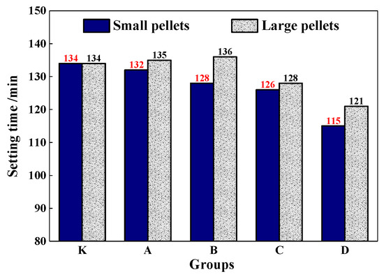 The setting time of the mortar was shown in Figure 13. It shows that CHPs had less effect on the setting time of mortar, especially for the large pellets. With the dosages of Na2CO3 increasing in pellets, the setting time of mortar decreased accordingly. The setting time of mortar with pellets D-S was 15% lower than with pellets B-S. As for the small pellets, when the dosages of Na2CO3 were 0%, 5%, 10% and 15%, the setting time was reduced by 2 min,6 min, 8 min and 19 min respectively. Combining with the fluidity test, it indicated that the addition of CHPs into fresh cement led to the early rapid release of Na2CO3. With the setting and hardening of mortar, the release was suppressed and the setting time was partially compensated, especially for Pellets C. This improved the fluidity of mortar and had nearly no reduction effect on the setting time.