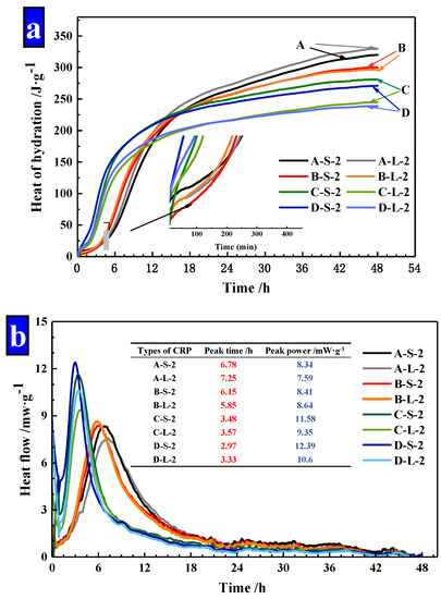 The effects of CHPs worked on the hydration process of fresh mortar were carried out by TAM Air (Waters, Milford, MA, USA). This test was conducted according to GB/T 12959-2008 [36] and operated in a temperature humidity chamber with 100% humidity at 20 °C. The temperature was recorded for the first 48 h at a frequency of once a minute. In this study, the content of CHPs was set at a constant value of 20%, and the types and sizes of CHPs were mainly investigated and discussed.