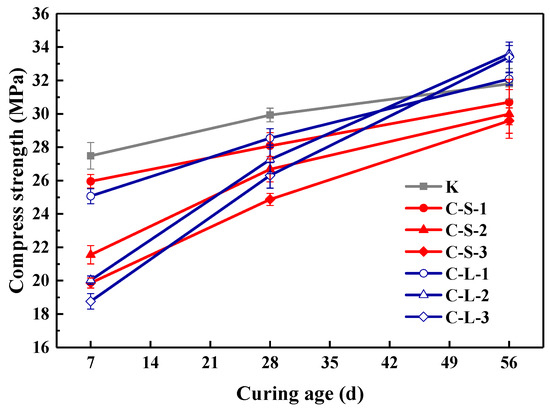 The compressive strength of specimens at the 7th, 28th and 56th day is presented in Figure 15. The addition of large CHPs decreased the early compressive strength but increased the later strength of mortar. On the seventh day, the strength of specimens introduced with CHPs was lower than Group K; meanwhile, the strength of specimens with large pellets was lower than with small pellets. This is caused by the release of Na2CO3 of large pellets in the early stage being less than that of small pellets. On the 28th day, the strength of specimens with CHPs was lower than Group K, but those with large pellets had higher strength than those with small pellets. On the 56th day, the specimens with large pellets showed the highest strength; the strength of mortar with small pellets was still lower than Group B. This is due to the slow release of CO32− in the healing pellets, which gradually improved the strength of specimens. It showed that the replacement of sand with CHPs increased the strength growth rates of mortar than Group K. In summary, the addition of CHPs into mortar realized the compatibility between healing pellets and cement mortar preliminary, however, the release of Na2CO3 in mortar challenged the later healing effect.
