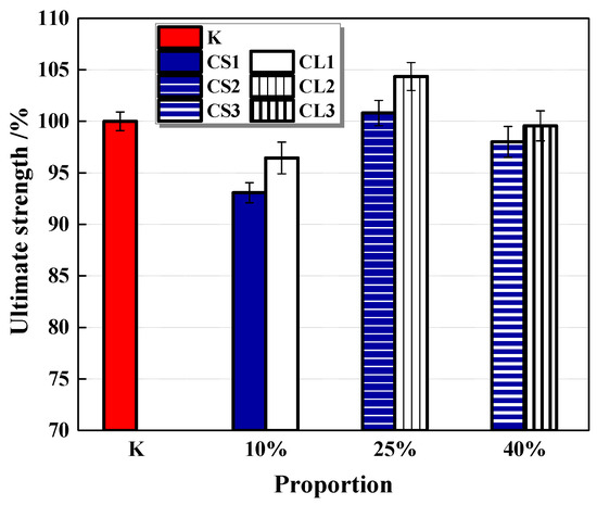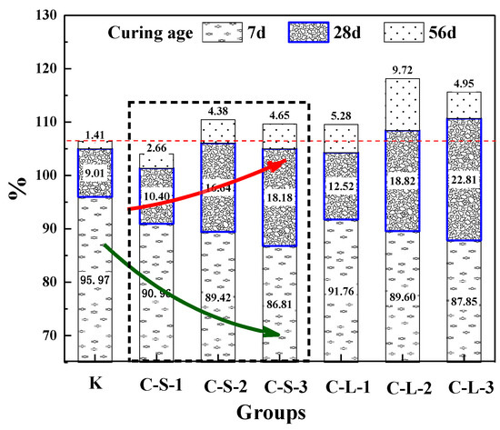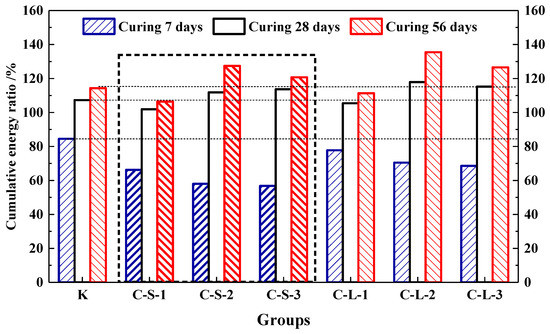 In this study, the energy produced by the loading process to 60% Fmax was accumulated. The energy ratio is shown in Figure 20. For the first seven days, Group K showed the highest energy recovery ratio, which was the highest flexural strength healing rate, too. With the contents of pellets increasing in mortar, the energy recovery ratios were gradually decreased. It means that the addition of CHPs decreased the early healing ability of mortar. For the curing age of 28 days, there was an obvious increase in the energy recovery ratios of the mortar with CHPs, which meant that pellets had a good healing efficiency on concrete than Group K in this period. The energy recovery ratios were gradually increased with the contents of pellets increasing. It means that the addition of CHPs increased the bonding strength of mortar, which produced higher energy during loading. For the curing age of 56 days, the increase in energy recovery ratios was a little less. The groups introduced with CHPs had a better healing effect than Group K. Groups C-S-2 and C-L-2 had the highest energy recovery ratio, while the 40% contents of CHPs had a worse energy recovery ratio. It could be concluded that the flexural strength healing ratios of mortar were improved by CHPs. When the content of CHPs was 25%, the highest flexural strength of the mortar was after healing.