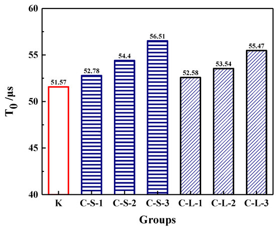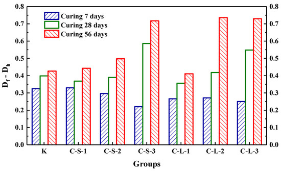 The initial transmitting time (T0) was performed to investigate the compactness of mortar before loading. As shown in Figure 18, the most compact specimens were Group K, and with the contents of CHPs increasing, T0 showed an upward trend. It meant that the addition of CHPs decreased the compact of mortar, which was not only caused by the low density of CHPs, but also by the loosened structures around the pellets (caused by Na2CO3). When the contents of small pellets were 10%, 25% and 40%, the transmitting time was 2.345%, 5.49% and 9.589% higher than Group K, respectively. Plus, the time that the pulse transmitted through specimens with large pellets was shorter than those with small pellets, meaning that smaller pellets had higher dosages of Na2CO3 released in mortar, which decreased the density and strength of mortar. T1 and T2 were tested after specimens had been preloaded and cured for 7, 28 and 56 days, separately, as Figure 19 illustrates. The damage parameter (Df-Dh) showed that CHPs had a long-term filling effect in mortar. For the specimens cured for seven days, it was found that the higher contents of pellets in mortar caused more serious damage after preloading. For the specimens cured for 28 days, the healing effects of mortar with pellets were obvious. When the contents of pellets were 45%, the healing effects of mortar were the best. For the specimens cured for 56 days, it was known that the healing effect of Group K and Group C-S-1 was slightly different after curing for 28 days and 56 days, but the healing effect with small pellets decreased gradually with the increased contents of CHPs, which indicated that the healing effects of mortar with small pellets were not as good as those of large pellets.