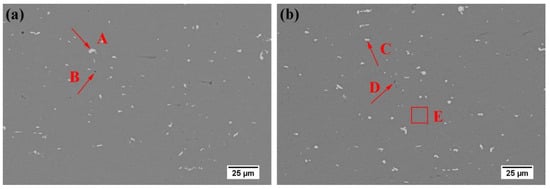 Figure 1 shows the SEM morphology of alloy AA and AZ after quenching. There are two types of secondary phase particles that can be observed in the alloy matrix: one is a white particle, which is mostly in strips and blocks and uniformly distributed in the matrix, the other is a black or grey spheroidal phase. EDS analysis results of Table 2 show that the white particles are Al-Fe-Mn-Si phase, and the black or grey particles are Mg2Si phase [20]. Image J software was used to analyze multiple fields of view of alloys AA and AZ, and the area fractions of the second phase particles were 1.29% and 1.24%, respectively. It can be seen that the addition of Zn has little effect on the secondary phase particles after quenching. However, we can find that the Zn atoms dissolved into matrix, according to the EDS results of the red square E, as shown in Table 2.