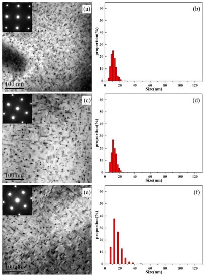 The samples after solution treatment were prepared according to standard metallographic techniques and observed by ZEISS M10A SEM equipped with X-ray EDS system. To verify the consistency of the result, five SEM photos where at least 10 particles were analyzed by EDS. The intragranular precipitates and the grain boundary precipitates were observed by Tecnai G2 20 ST transmission electron microscope (TEM, Thermo Fisher Scientific, Waltham, MA, USA) equipped with X-ray EDS system, operated at 200kV, and the diffraction direction was [001]Al. The initial samples were ground on 80, 600, 1500, and 2000 grit SiC paper to a thin layer of around 100 µm in thickness. Disks of 3mm in diameter were stamped out from the film. Then the TEM samples were prepared by twin-jet electropolishing method with electrolyte made of 70% methanol and 30% nitric acid at temperature of −25 °C. Quantitative TEM analysis was conducted on five positions of samples, where at least 100 particles were counted and measured to determine their sizes by Image J software. The number density has been estimated by dividing the number of precipitates by the volume (thickness of the foil × area) of the field. The volume fraction of precipitates has been estimated by multiplying the number density and the average volume of the precipitates.