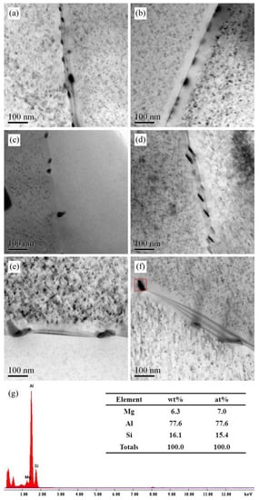 TEM and EDS analysis on grain boundary precipitates of alloy AA and AZ under aging at 170 °C: (a,c,e) alloy AA, (b,d,f) alloy AZ, (a,b) under aged state, (c,d) peak aged state, (e,f) over aged state, and (g) EDS analysis of the precipitates.